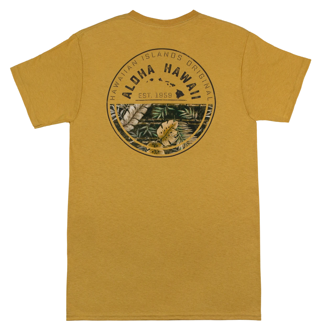 This iconic print features the Hawaiian Islands along with tropical rainforest imagery.