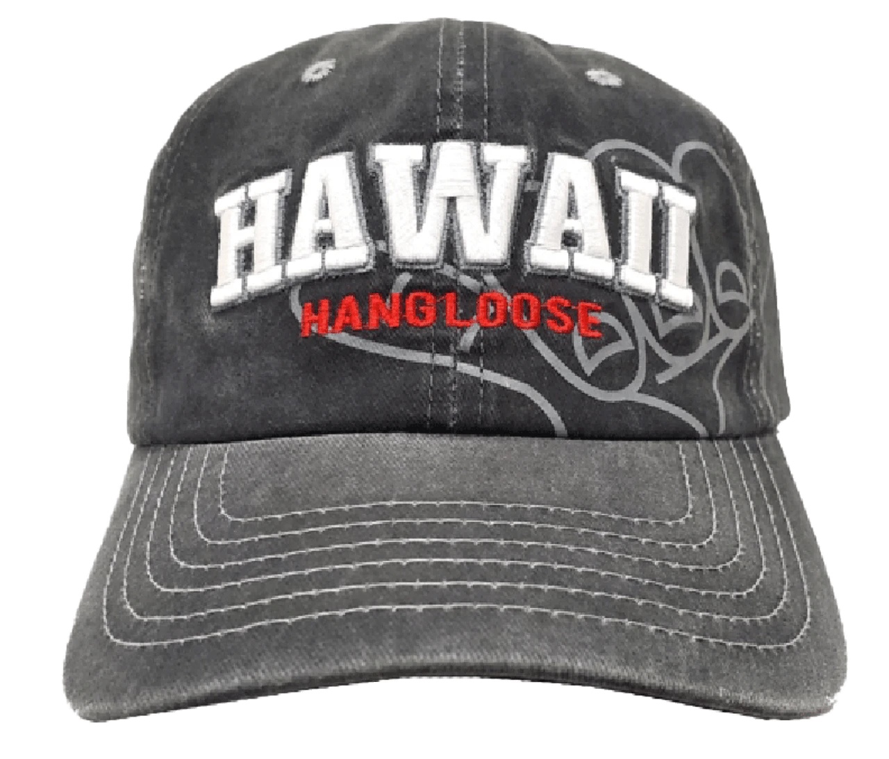Vintage washed cotton twill frayed bill cap with embroidered Hawaiian design.