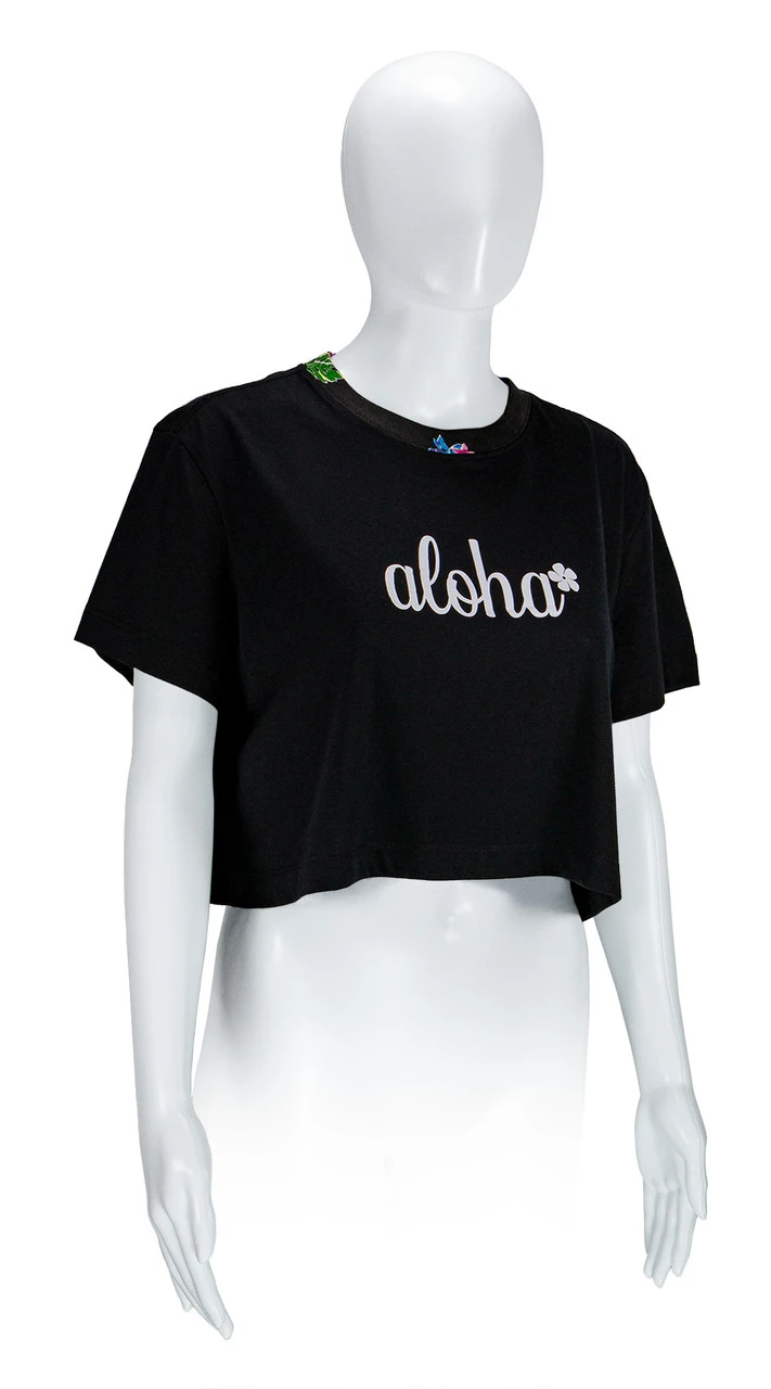 This tee has a relaxed fit that’s cropped above the navel with a Hawaiian printed neckline.