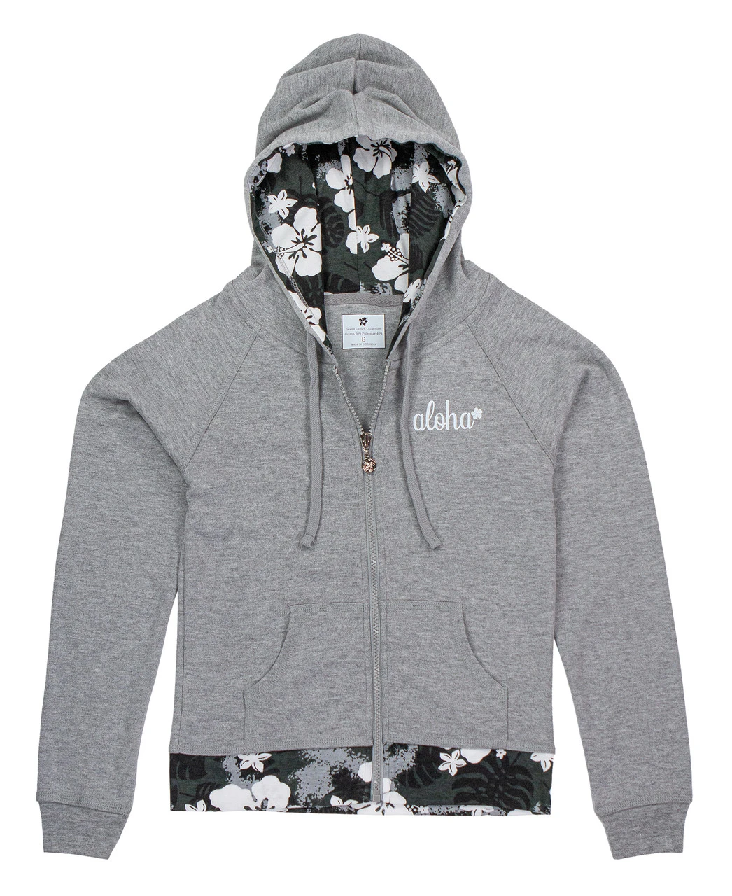 Zip up sweatshirt with drawstring hood which is lined in a Hawaiian print. This hoodie also has a front kangaroo pocket along with a printed band at the waist that is form fitting for flattery and contoured to accentuate!