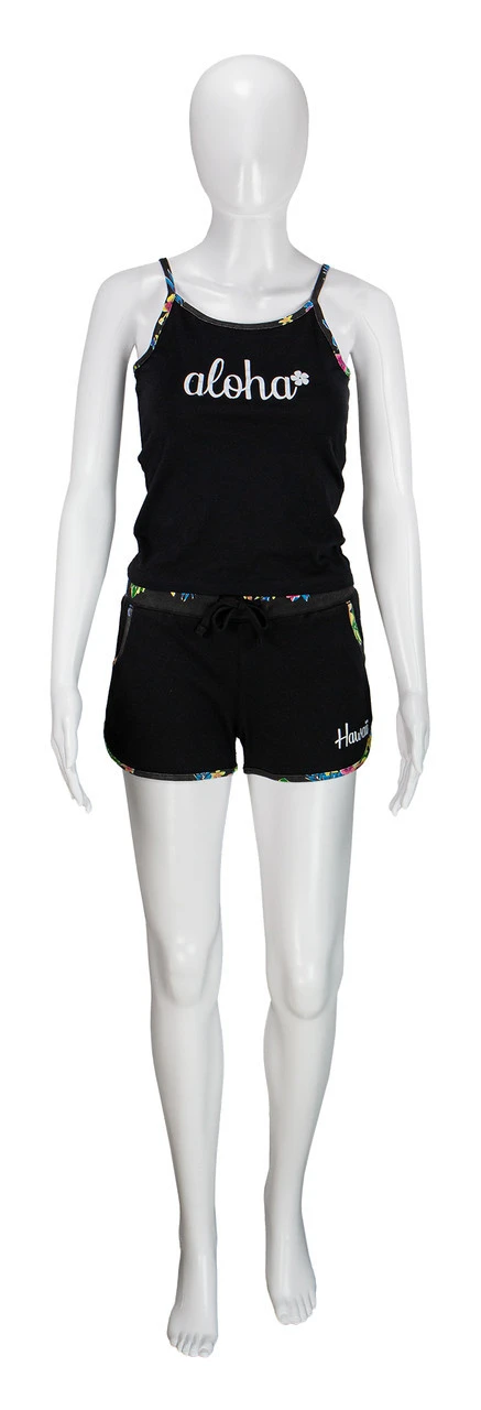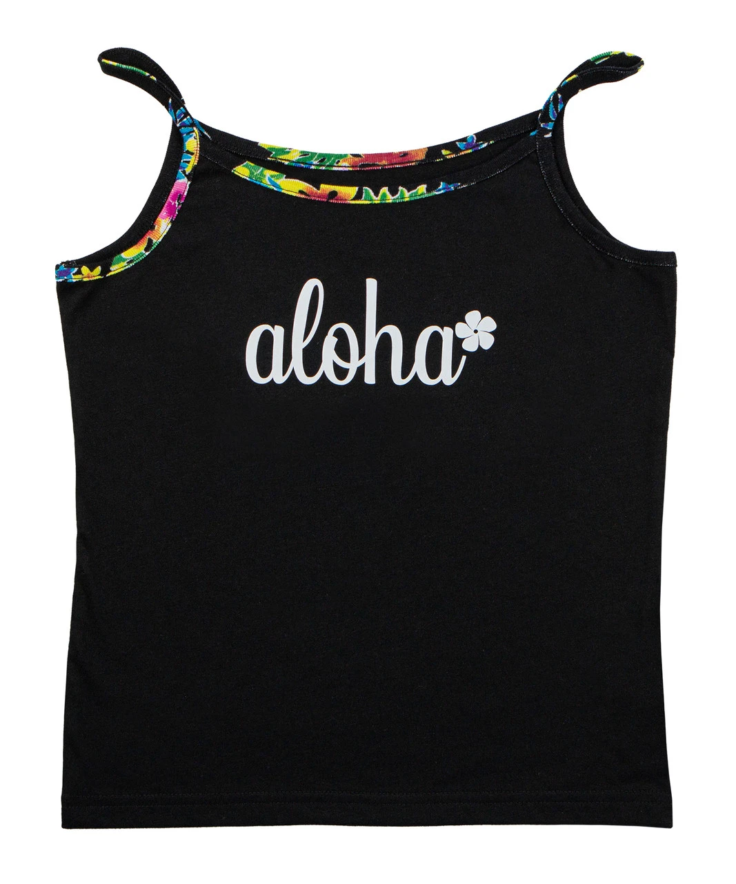 Strap tee with Hawaiian printed trim that is form fitting for flattery and contoured to accentuate!