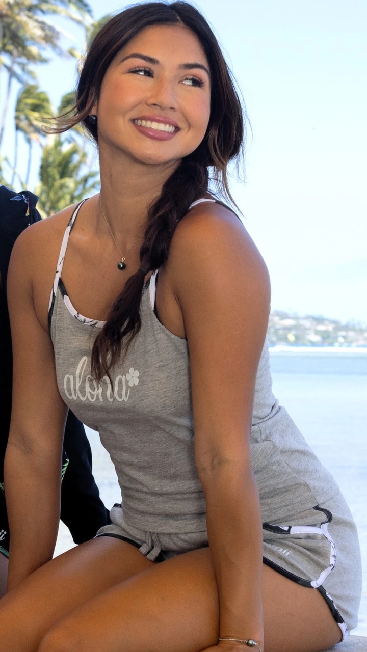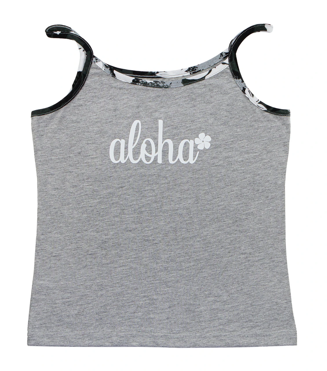Strap tee with Hawaiian printed trim that is form fitting for flattery and contoured to accentuate!
