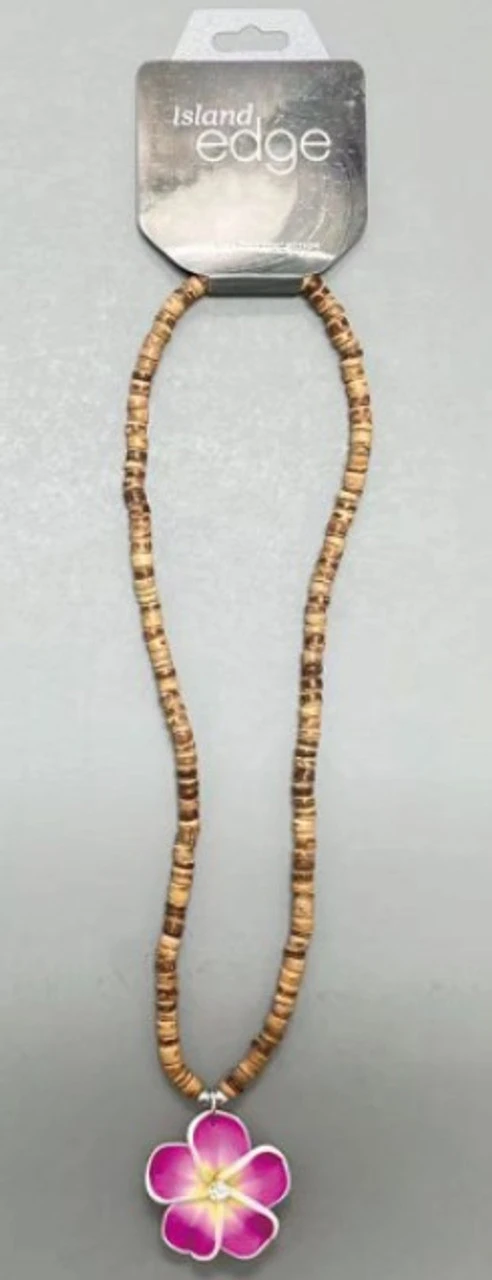Island-inspired beaded necklace with a Magenta plumeria pendant. Great for natural styles.
