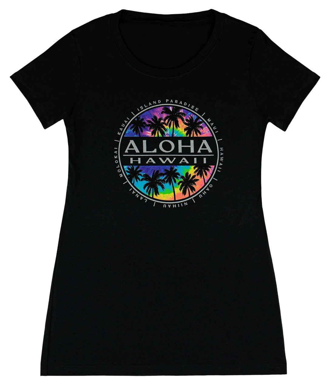 Bringing Tie Dye back! These “psychodelic” colors blend the old with the new in a colorful palm tree circular design.