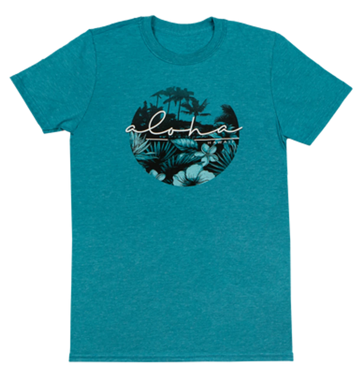 Aloha Hawaii tee with a scenic backdrop of palm trees and assorted hawaiian flowers.