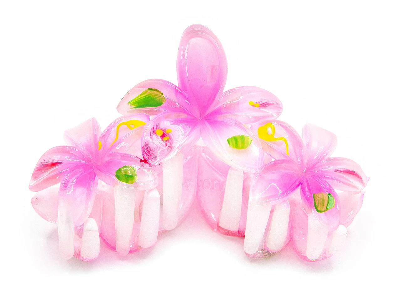 Jaw style hair clip with miniature triple plumeria design and handpainted floral patterns